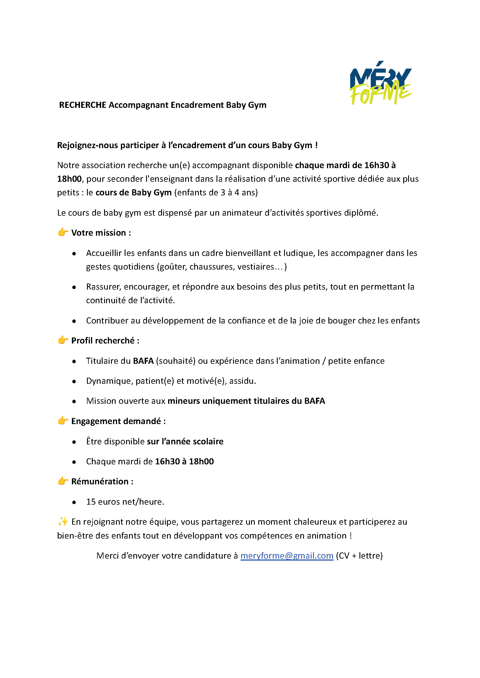 L'association Méryforme recherche des bénévoles à compter du 15 septembre !