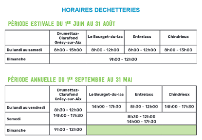 Les déchets acceptés : Gravats, Verre, Tontes de pelouse, taille de haies, Déchets encombrants, Bois, palettes, Plastique, Métaux, Textile, Papiers, livres..., Huile de vidange, batteries, Pneumatiques, Déchets toxiques, Gros cartons Attention : les pneus sont acceptés, mais déjantés. | La déchetterie est réservée aux habitants des communes d’Aix les Bains, de Brison-Saint-Innocent, de Drumettaz-Clarafond, de Grésy-sur-Aix, du Montcel, de Méry, de Mouxy, de Saint-Offenge Dessous-Dessus, de Trévignin, de Viviers du Lac et de Voglans. Qui peut l'utiliser et à quel prix ?
